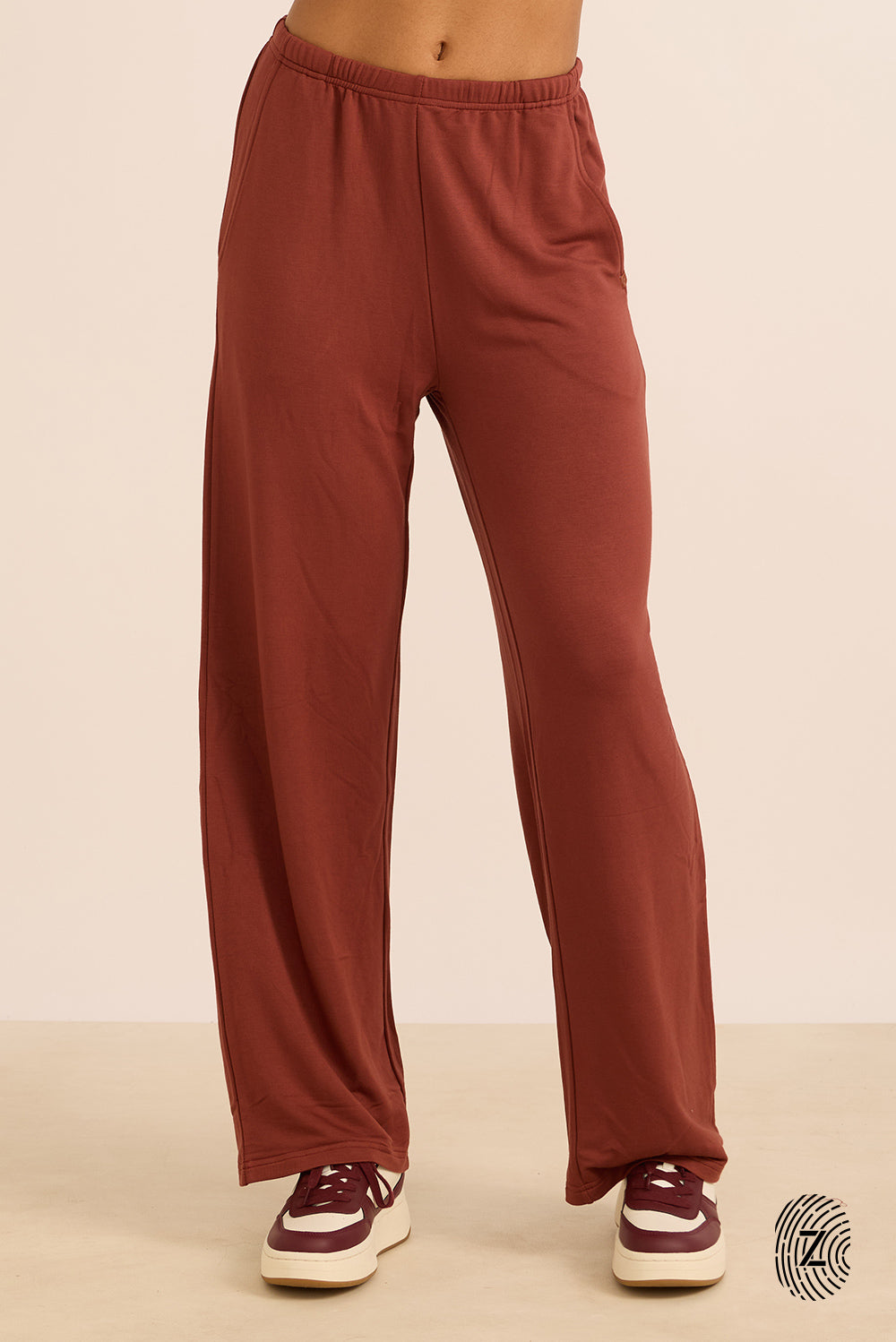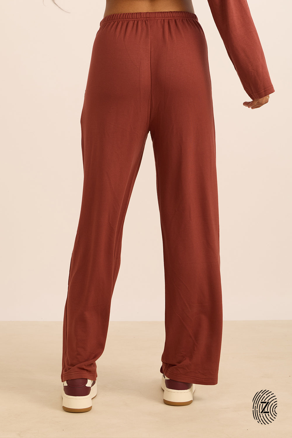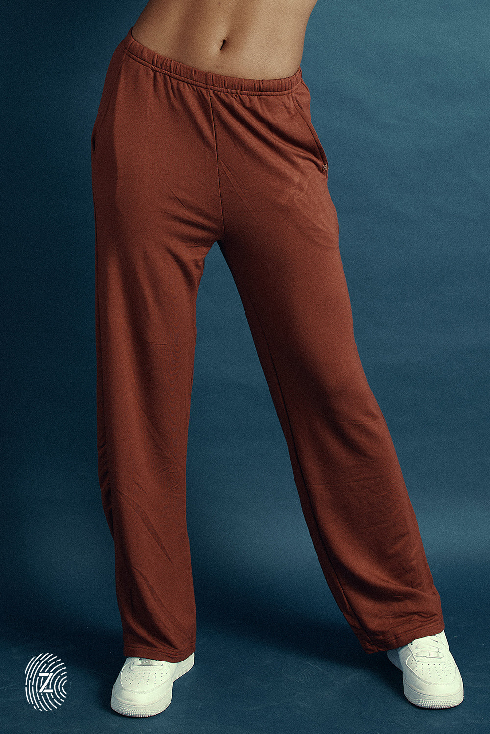 מכנס מתרחב, בשילוב גומי בחגורה ושרוך פנימי, כיסים צדדים, בגוון אדמה