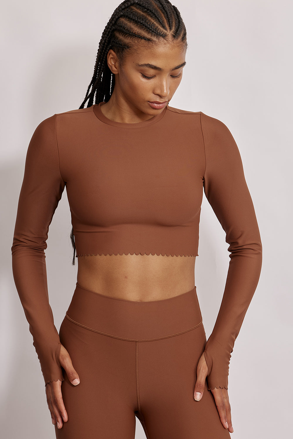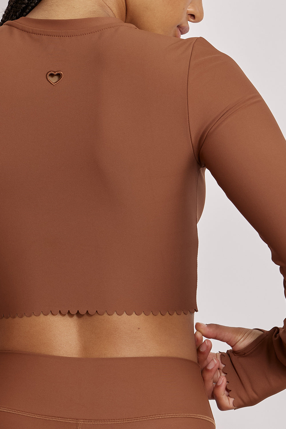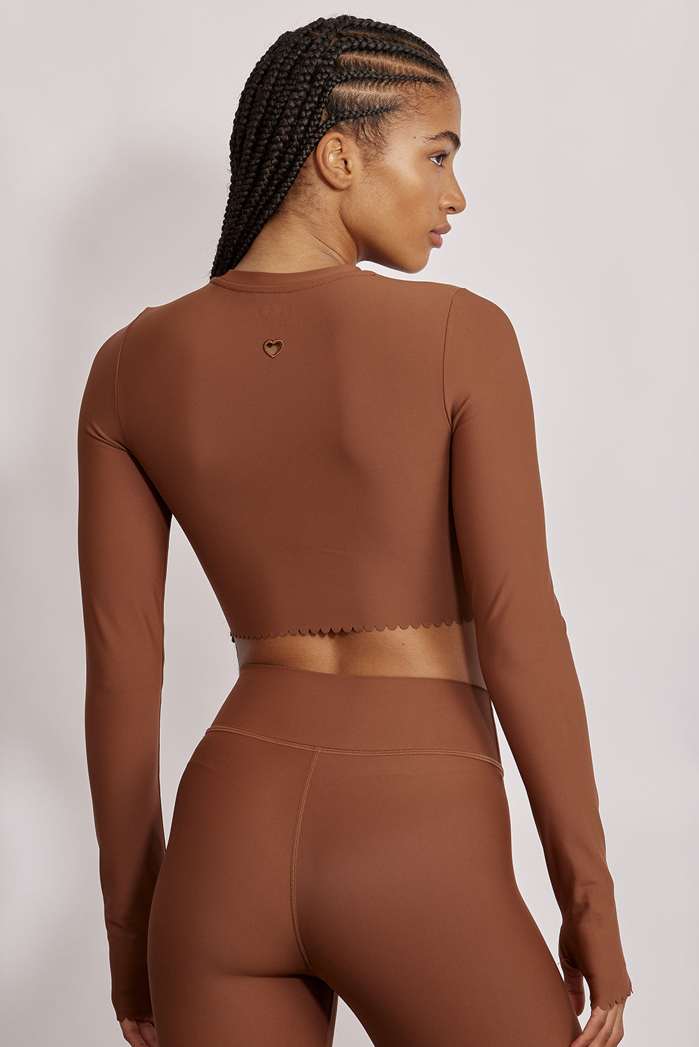חולצת קרופ שרוול ארוך מהקולקציה בעיצובה של אדל בספלוב, בשילוב של חיתוכי לייזר, חיתוך לב בפריט ללא שכבה פנימית, מקום לאגודל, גוון חום.